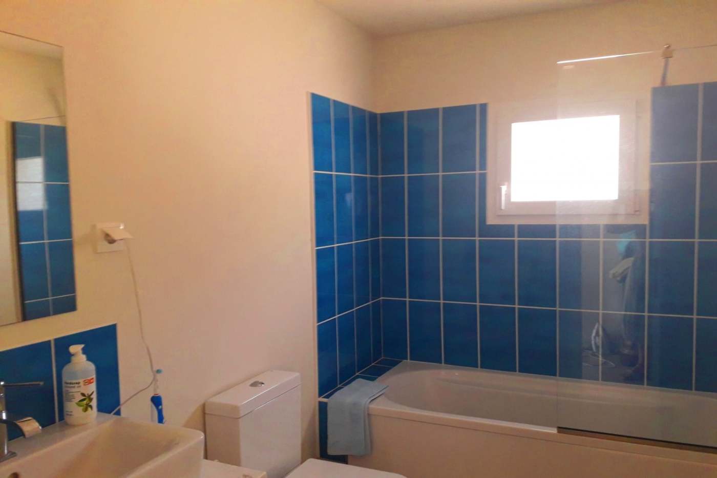 The ground floor consists of the kitchen, an open plan living/kitchen area with large windows, from where you have access to the pool area. As well as a bedroom with its own bathroom, ready to accommodate your friends.